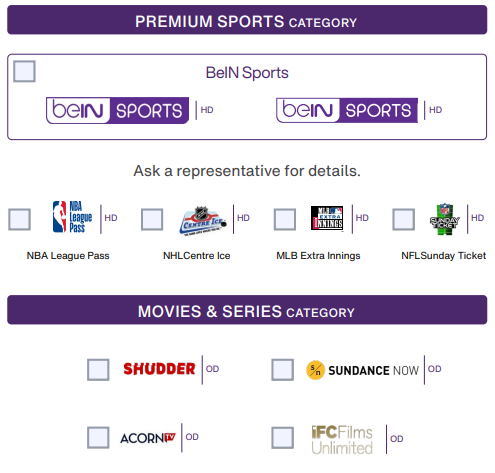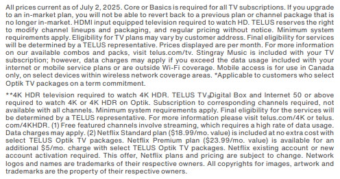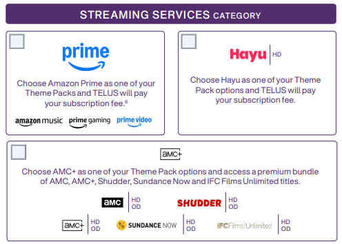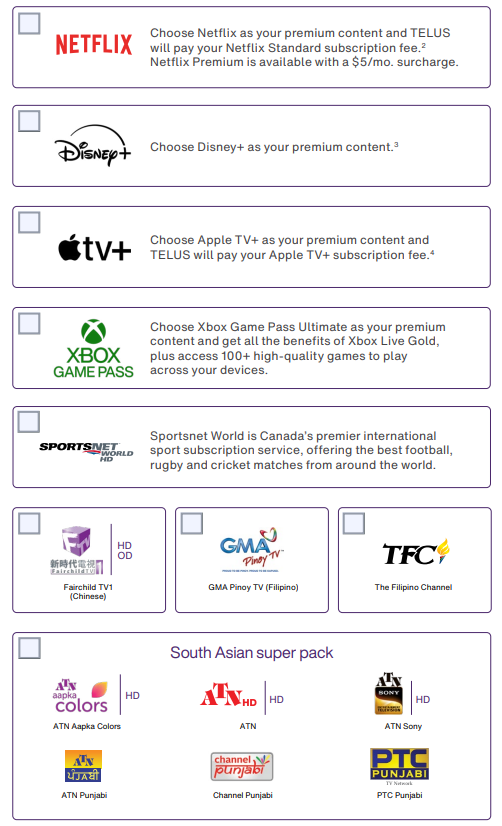 Personalize your entertainment experience with our bundled packages. Ask us for more options. Eligibility for TV plans may vary by customer address. You can switch your Premium and Theme Pack selections every 30 days online on the MyTELUS website.