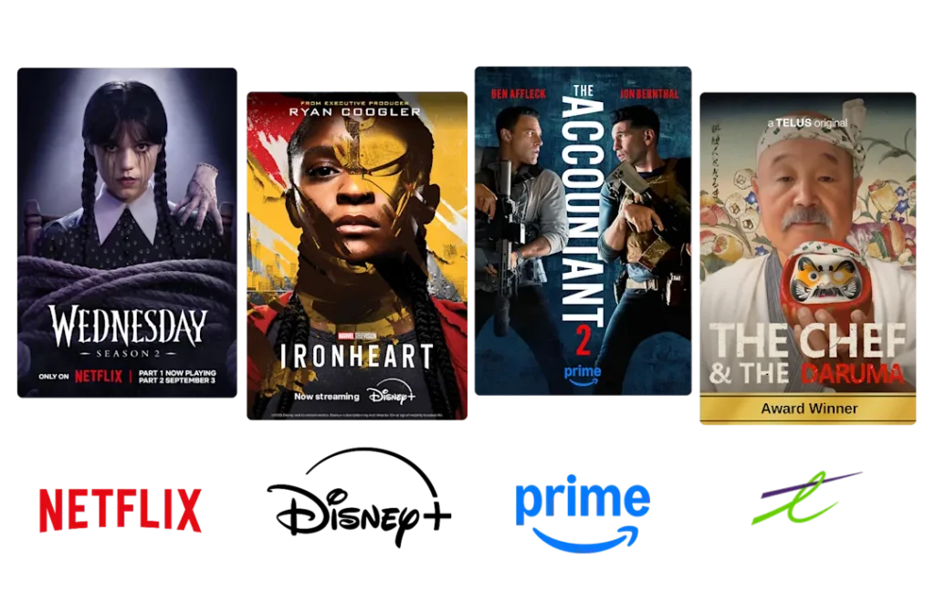 Only with TELUS – unlock exclusive savings on the 3 most popular streaming services. Plus, enjoy TELUS Films & Series, and 50+ free streaming channels.